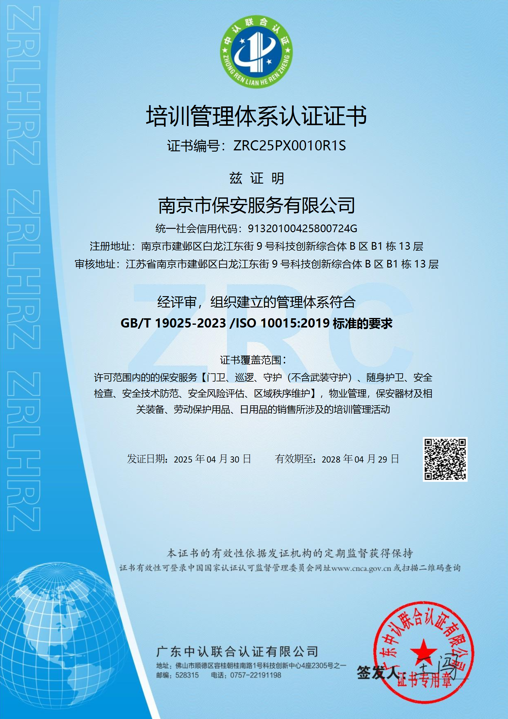 南京市保安服務有限公司(原南京市保安服務總公司)成立于1987年4月,是一個有著悠久安保經(jīng)營歷史和安保經(jīng)驗沉淀的大型國有保安企業(yè),現(xiàn)為中國保安協(xié)會常務理事單位,江蘇省保安協(xié)會常務理事單位,南京市保安協(xié)會副會長單位,江蘇省一級保安服務公司。